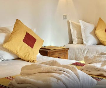 Ce spacieux logement triple comprend la climatisation, un coin salon et une salle de bains privative avec douche. Il dispose également d'un coin repas, d'une armoire, du chauffage et d'un accès à une terrasse. Le logement est équipé de deux lits.