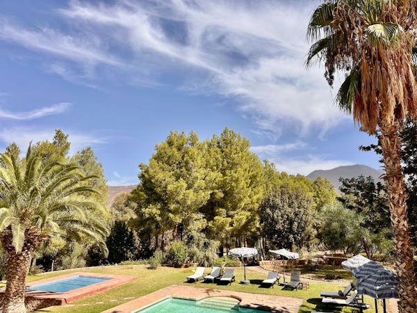 Cette grande chambre quadruple est climatisée et dispose d'un coin salon, d'une salle de bains privative avec douche, d'une armoire, du chauffage et offre une vue sur la piscine. Elle comprend trois lits.